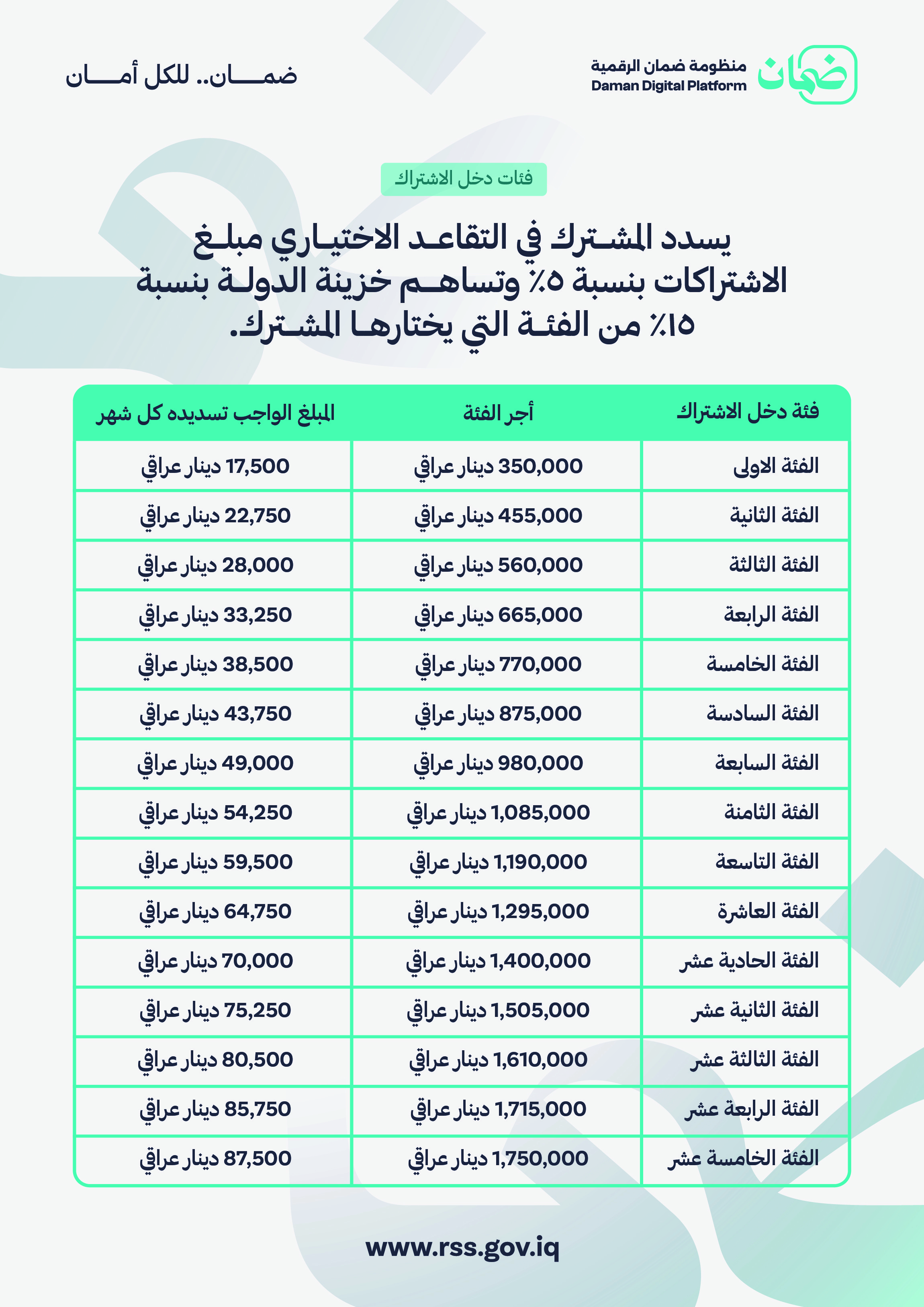 وأشارت الوزارة إلى أن فئات الاشتراك تشمل 15 فئة، مع تحديد الحد الأدنى للاشتراك عند 17,500 دينار شهريًا، والذي يتيح للمشترك راتب تقاعدي مقداره 350,000 دينار. كما أوضحت أن الدولة تساهم بنسبة 15% من الاشتراك وفق الفئة التي يختارها المشترك، وذلك وفق الجدول المحدد: